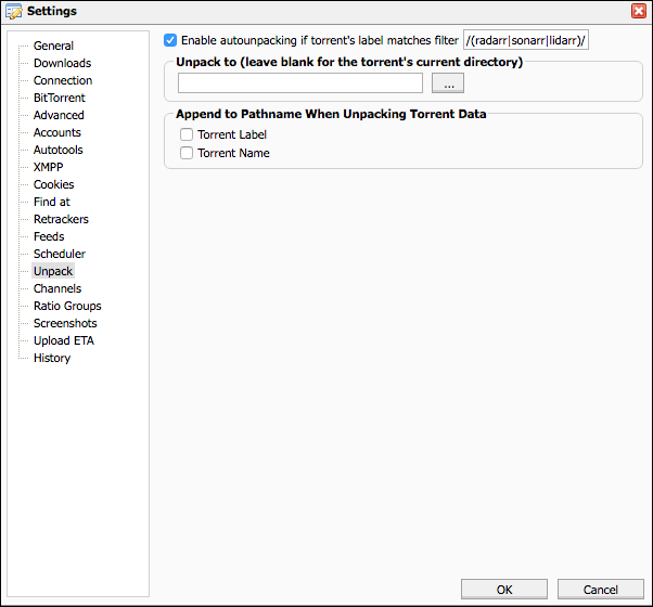 Check "Enable autounpacking if torrents label matches filter" and add the following: