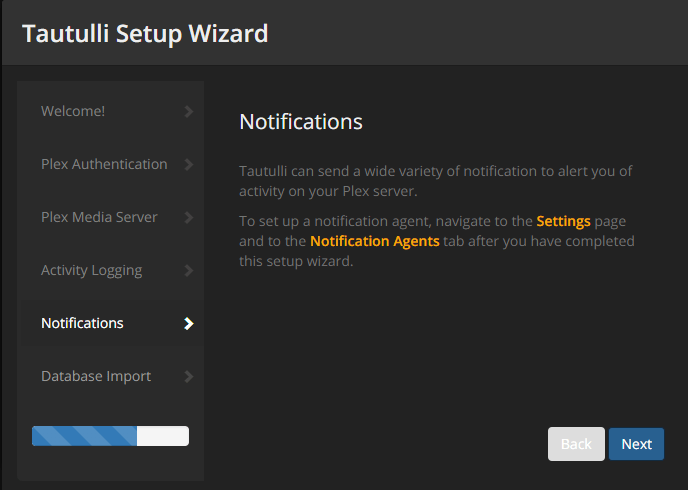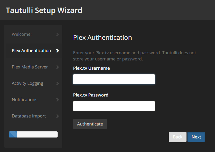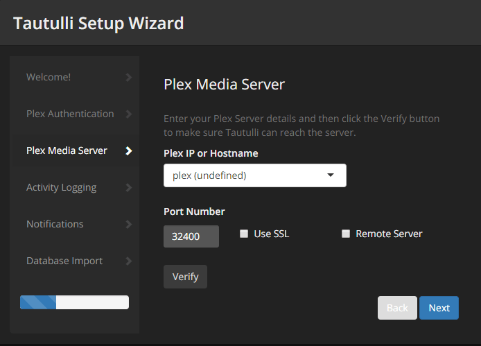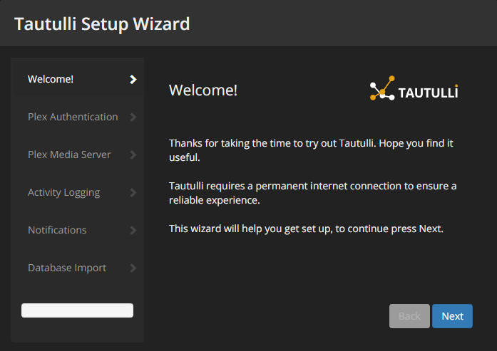 First time you go to the Tautulli site, you will be presented with the "Tautulli Setup Wizard". Click