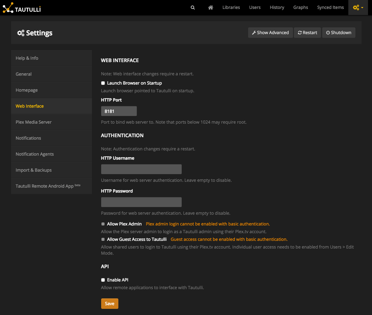 Click "Web Interface" on the left. Fill in "HTTP Username" and "HTTP Password (this will be the login for your Tautulli site), but don't click